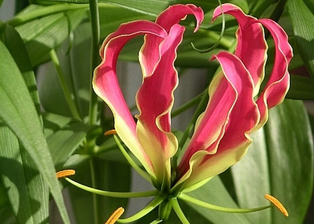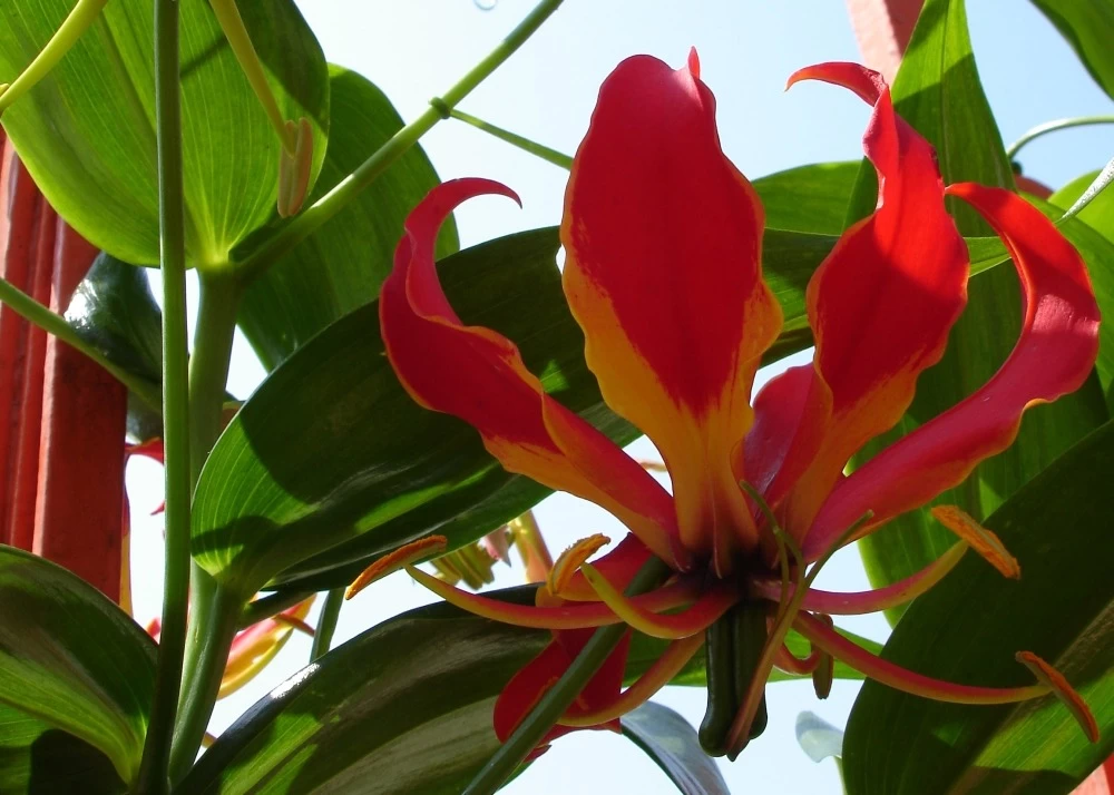 le lis de malabar exotique est un abrisseau vivace grimpant qui atteint une hauteur jusqu’Ă deux mĂštres Ă l’aide d’un support pour plantes grimpantes et qui peut ĂȘtre bien entretenu en pot. Ses inflorescences sont durables une fois coupĂ©es. Les fleurs du lis de malabar sont rouge feu avec une bordure jaune vif et se montrent Ă partir de juin. Elles font penser Ă une couronne ou Ă un papillon avec ses six pĂ©tales frisĂ©es qui sont courbĂ©es vers l’extĂ©rieur. Les rameaux dĂ©licats deviennent trĂšs longs au cours de l’Ă©tĂ© et ont besoin d’un support auquel le lis peut s’attacher avec les pointes de ses feuilles.
