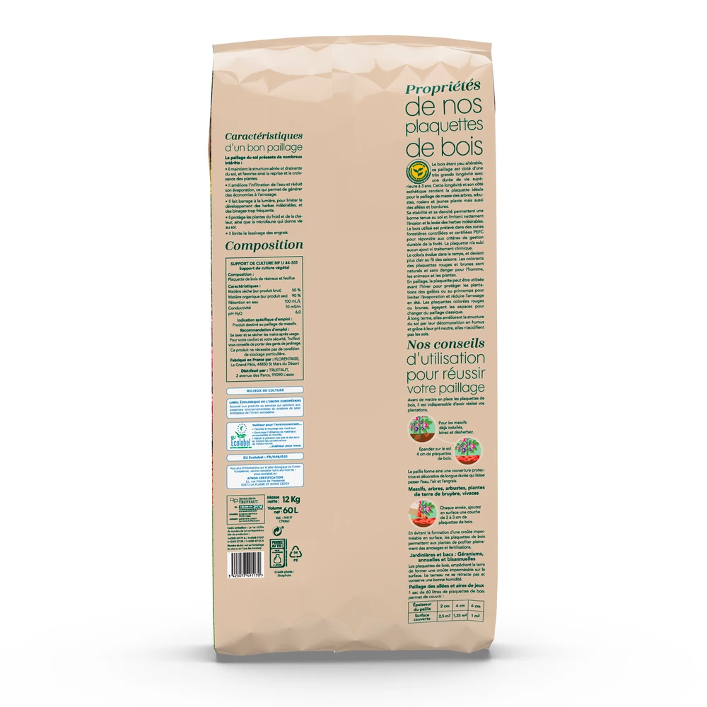 Le bois Ă©tant peu altĂ©rable, ce paillage est dotĂ© d’une très grande longĂ©vitĂ© avec une durĂ©e de vie supĂ©rieure Ă 3 ans. Cette longĂ©vitĂ© et son cotĂ© esthĂ©tique rendent la plaquette idĂ©ale pour le paillage de masse des arbres, arbustes, rosiers et jeunes plants mais aussi des allĂ©es et bordures. Sa stabilitĂ© et sa densitĂ© permettent une bonne tenue au sol et limitent nettement l’Ă©rosion et la levĂ©e des mauvaises herbes. Le bois utilisĂ© est prĂ©levĂ© dans des zones forestières contrĂ´lĂ©es et certifiĂ©es PEFC pour rĂ©pondre aux critères de gestion durable de la forĂŞt. La plaquette n’a subi aucun ajout ni traitement chimique.